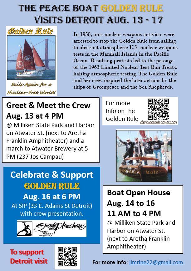 This summer, the VFP restored Golden Rule, which set sail in 1958 to stop nuclear weapons testing in the Marshall Islands and inspired many peace makers and peace ships that followed, will sail through the Great Lakes including a stop in Detroit: 13-17 August 2023; http://www.vfpgoldenruleproject.org/ .